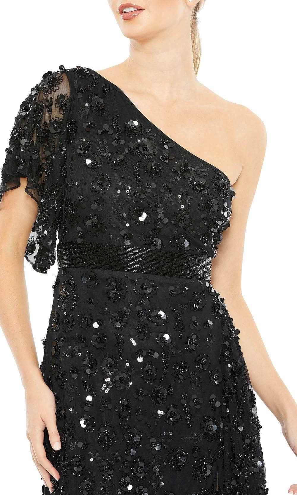 | Details: | One shoulder strap, Sheer, Beads, 3D Appliques, Sequins, Waistband, Zipper closure, Ruffles |
