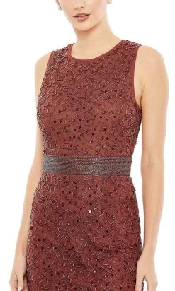 All eyes will be on you in this elegant Midi dress by Mac Duggal 93758. Embellished with a heavy touch of shimmering beads on a mesh overlay, this spectacular piece flaunts a geometric patterned beadwork all throughout. Featuring a sleeveless fitted bodice, with jewel neckline and high-back, all held by a concealed zipper at the back which ensures a perfect fit. The fitted skirt finishes at a tea-length size, just perfect for your immediate special affair. Gracefully drape yourself in style in this Mac Duggal masterpiece. Model is wearing Black, Brick, and Nude Silver colors.