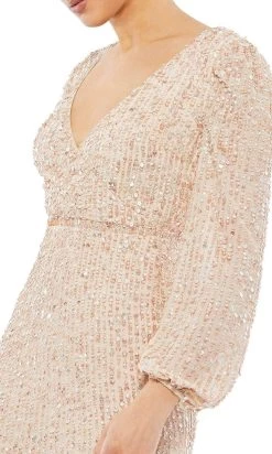 | Details: | Sequins, Long Blouson Sleeves, Full Back, Zipper Closure, Back Slit, Tea Length Hemline |