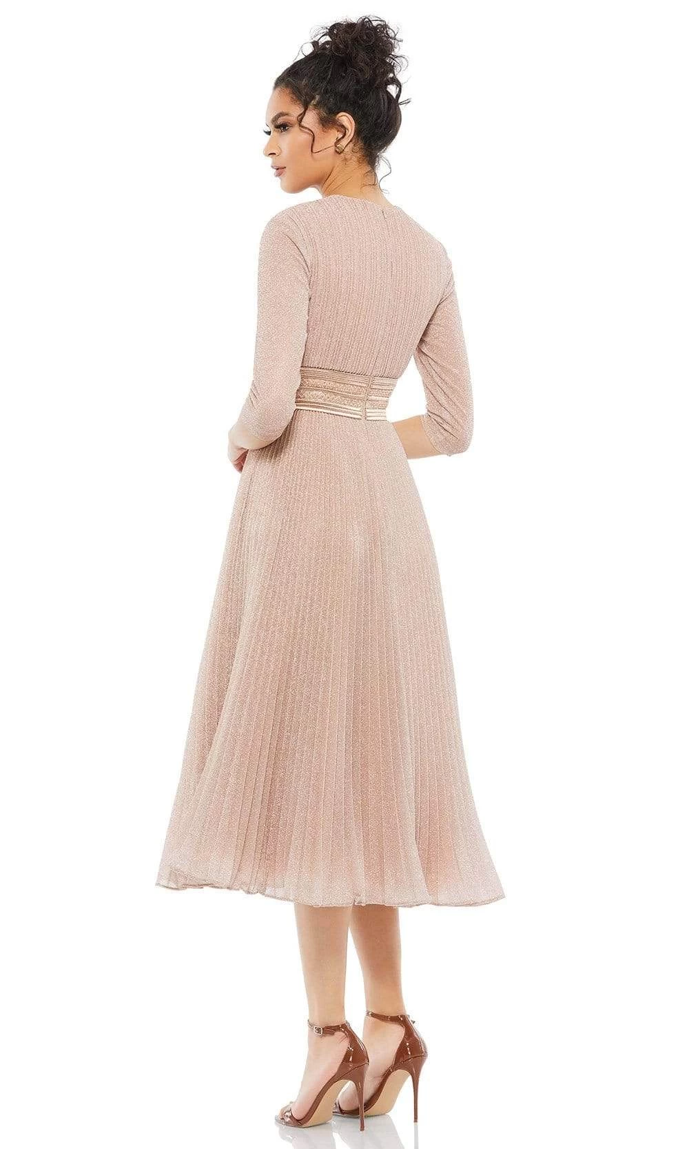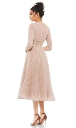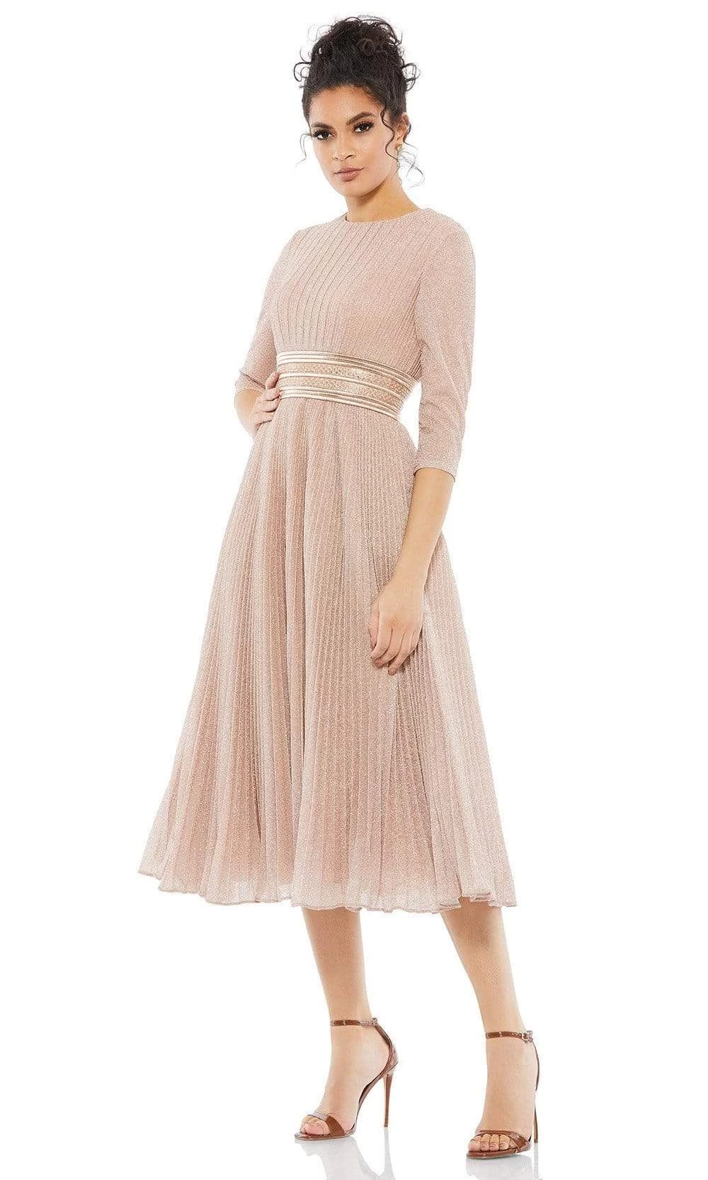 Walk into the room and fascinate everyone with this Mac Duggal 30750 creation. Alluringly rendered with fine pleats, this stunner evokes a jewel neckline with quarter sleeves. Defined at the waist with an embellished band, the shimmering skirt flares into a classy tea length hemline. Don a style that is iridescently charming in this Mac Duggal masterpiece.