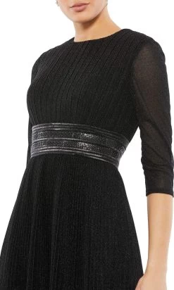 | Details: | Glitter Knit, Quarter Sleeves, Full Back, Zipper Closure, Pleated, Embellished Waistband, Tea Length Hem |