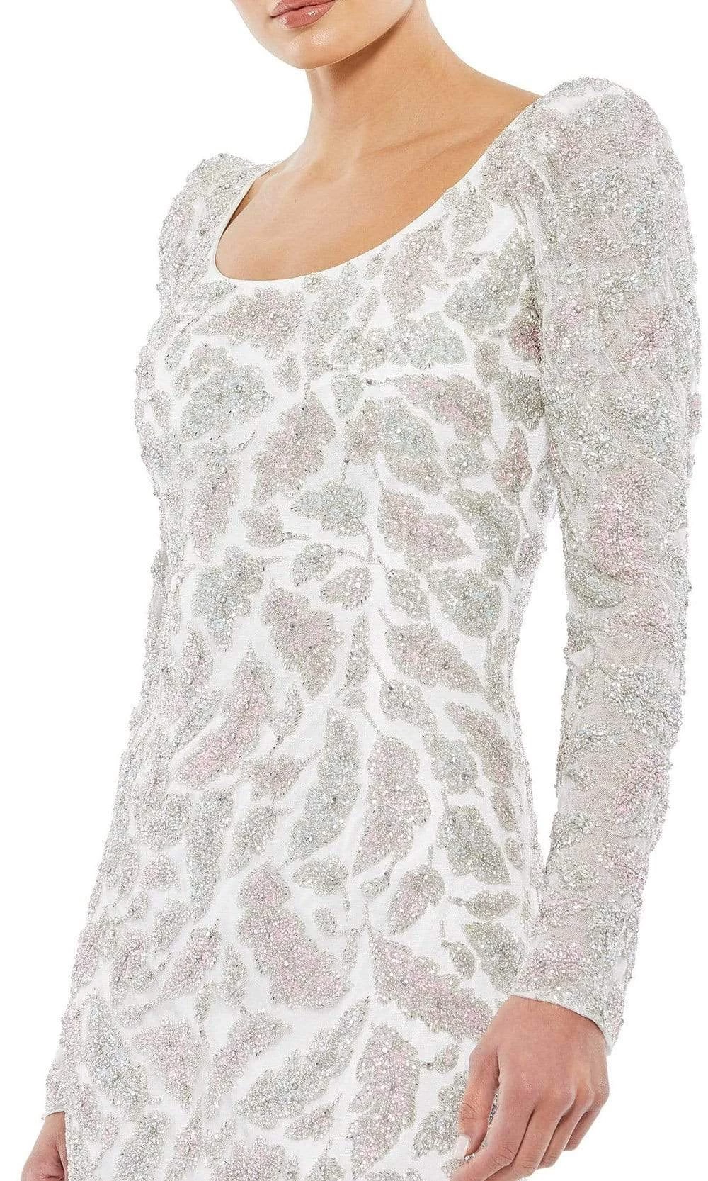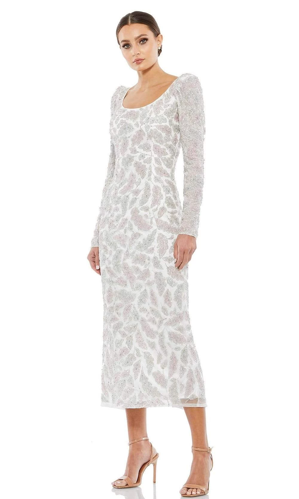Get noticed in this fantastic Mac Duggal 5424 dress. This tea-length dress fashions a scoop neckline supported by long sleeves in an embellished bodice. Revealing a sheath silhouette, this also fashions a scoop back with back zipper closure. Wrap up in this winning style for evening by Mac Duggal creation. Model is wearing Ivory color.