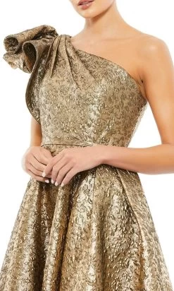 Turn into such an irresistible vision that captures everyone’s interest in this Mac Duggal 67906 cocktail dress. This dress fashions an asymmetrical neckline supported by a one shoulder bow in a metallic bodice with pockets. Revealing an A-line silhouette gracing down to its tea-length, this also displays a mid-open back to complete the look. Leave a trail of admirers as you glisten in beauty in this Mac Duggal creation. Model is wearing Antique Bronze color.