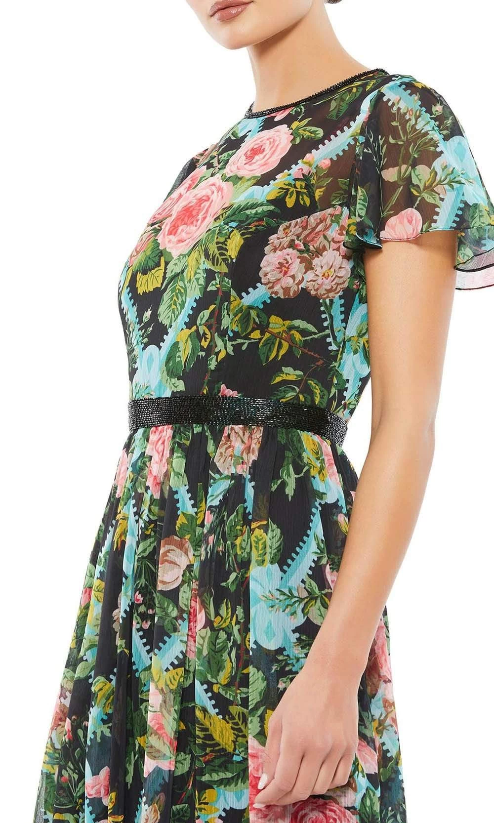 Showcase a style that is stunningly feminine in this Mac Duggal 9149 creation. Blooming with floral print details, this beauty shows a jewel neckline with fluttering short sleeves. Styled with a full back and a beaded waistband, the A-line skirt streams into a fluttering tea length finish. Walk into a room like a dream in this Mac Duggal masterpiece.