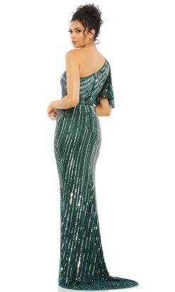 Be a woman of style and beauty in this masterpiece from Mac Duggal 5000. This long sophisticated dress makes a statement with its glittering sequins. It has an asymmetric neckline and a one shoulder sleeve. The fitted bodice is accentuated with a horizontal belt and has a back zipper closure. Finishing the look is a full length sheath skirt with a sweep train. Everyone who sees you will be left speechless and giddy in this Mac Duggal design.