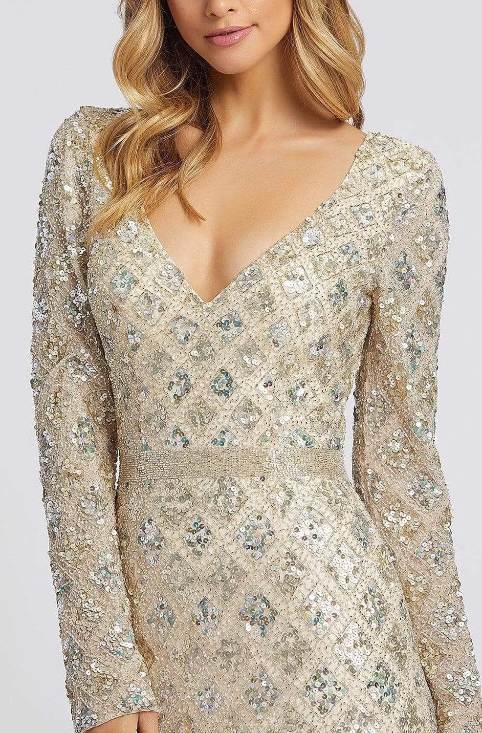 Shine thought the night with this totally amazing masterpiece by Mac Duggal Evening 5021. Fully designed with stunning sequin embellishments, this stellar gown features a fitted bodice with plunging V neckline, long sleeves and V back secured with a center zipper closure. The skirt parades a sheath silhouette which falls to a full length hemline, finished with a sweep train. Make it your moment to sparkle from the crowd wearing this Mac Duggal ensemble.