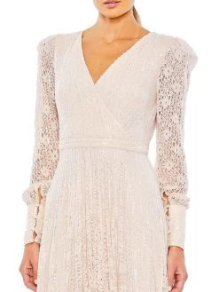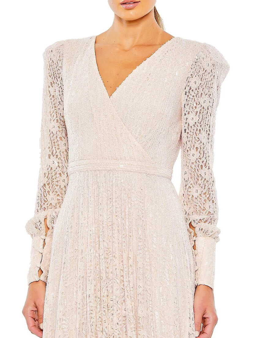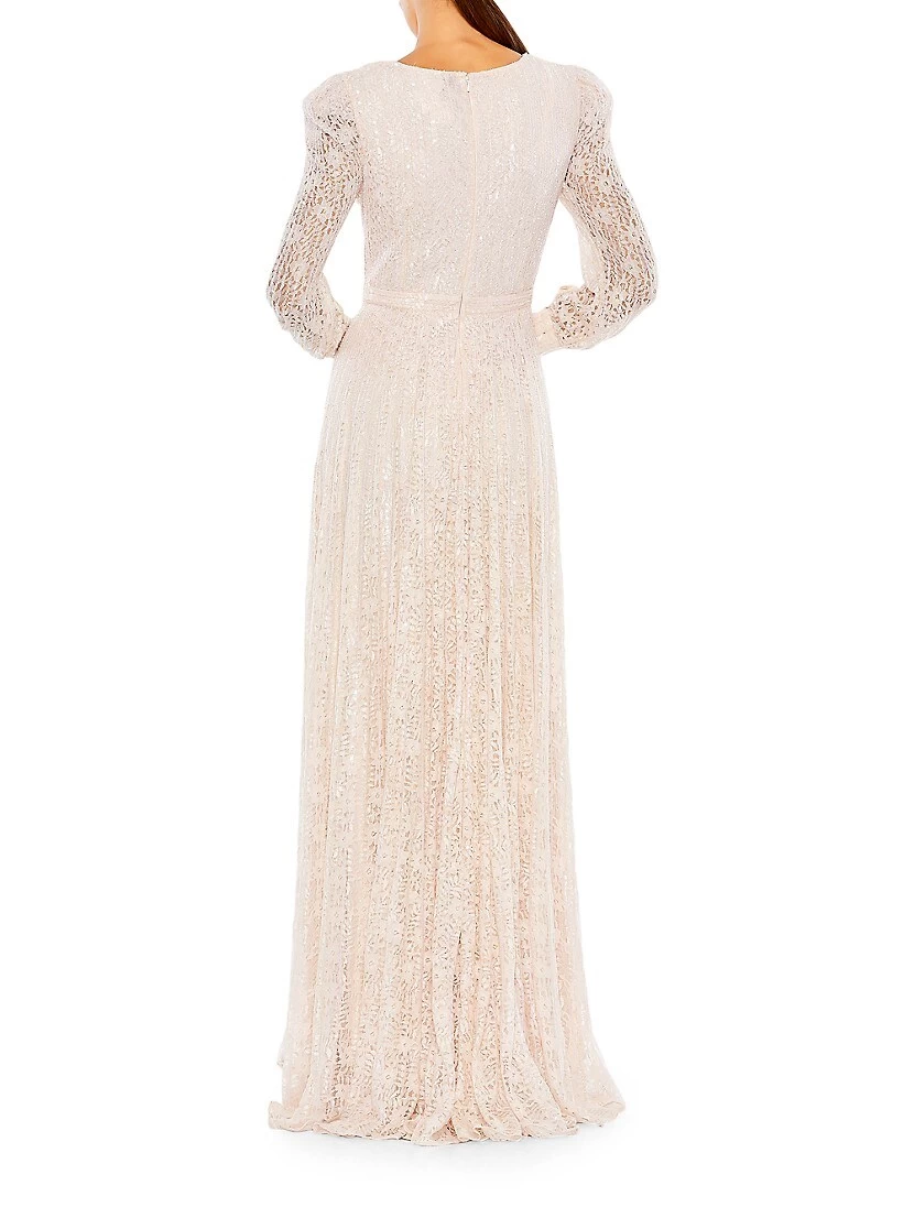 Mac Duggal’s A-line gown is crafted of delicate lace woven with metallic sequins. This style features a V-neck and long bishop sleeves with padded shoulders.
