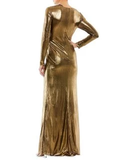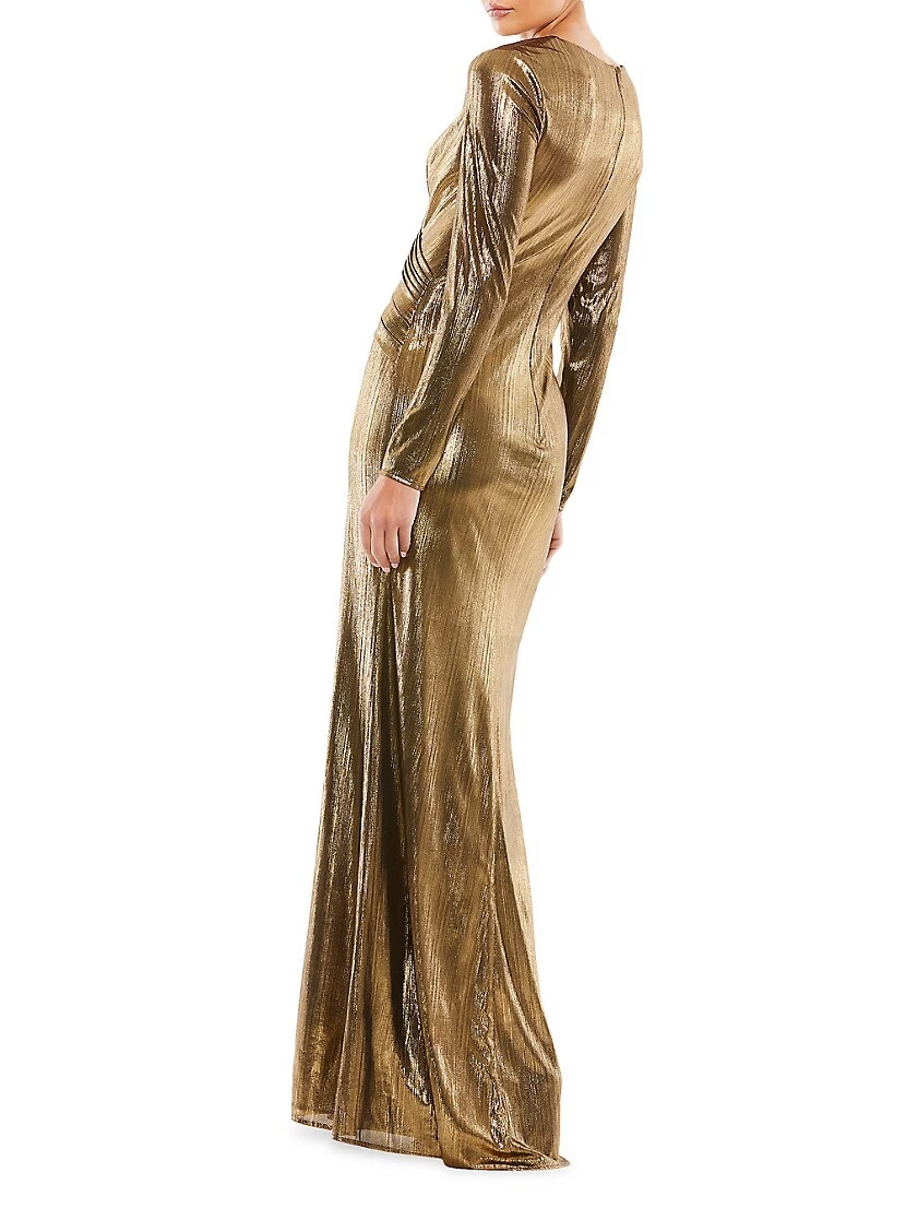 Crafted of eye-catching metallic fabric, Mac Duggal’s asymmetrical gown flaunts a ruched V-neck complemented by a flattering side leg slit.