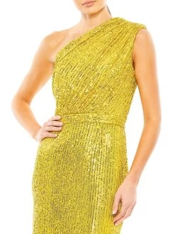 Designed in a one-shoulder style, this Mac Duggal gown is crafted of sparkling metallic fabrication.