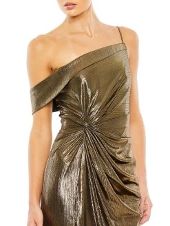 This stunning Mac Duggal gown is crafted of shining metallic fabric with detailed draping and a high skirt slit.