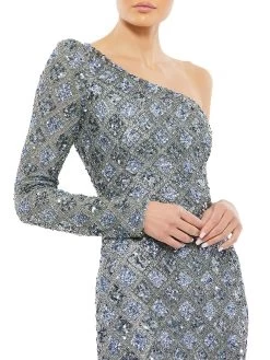 Flaunting one shoulder, Mac Duggal’s elegant gown is rendered in sparkling sequins with diamond-shaped beaded panels. This body-skimming silhouette is finished with a back leg slit.