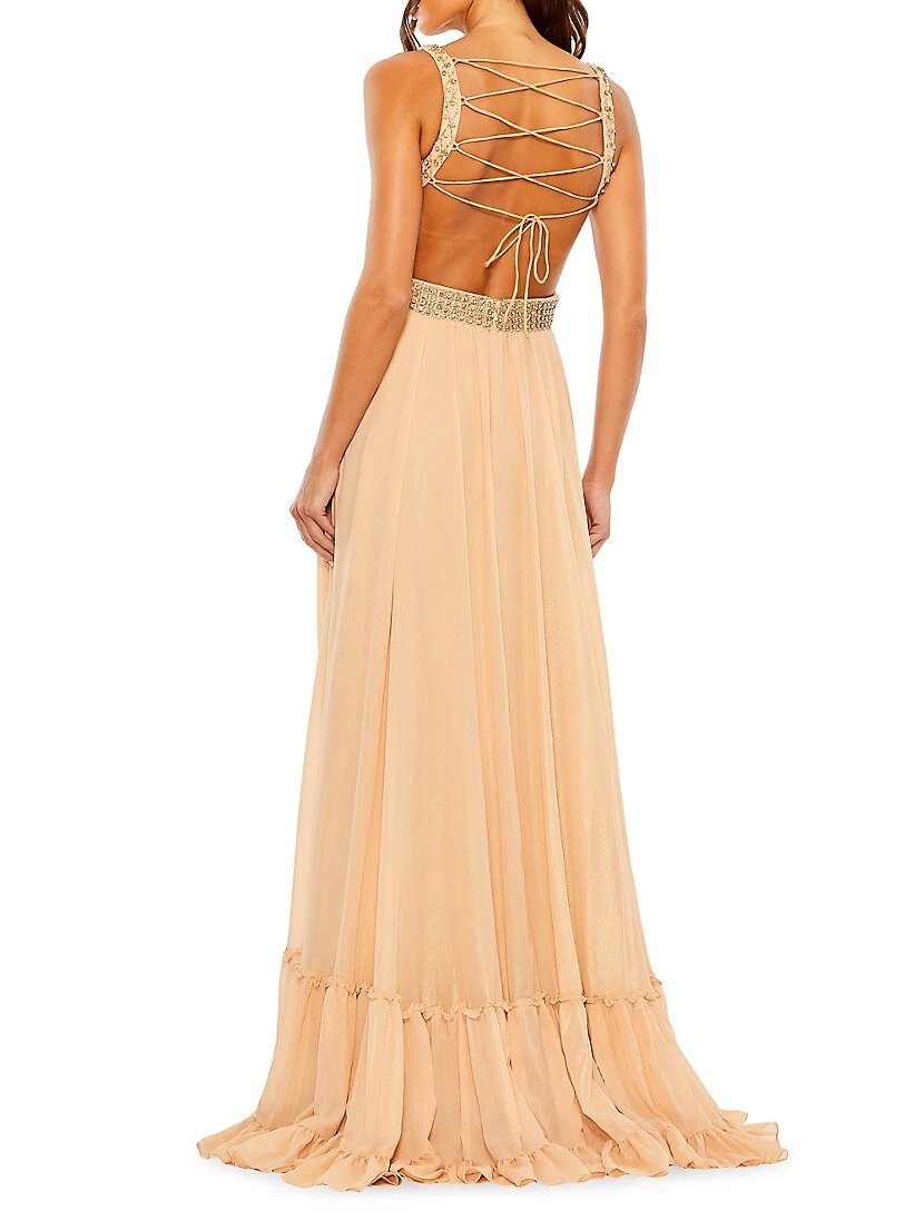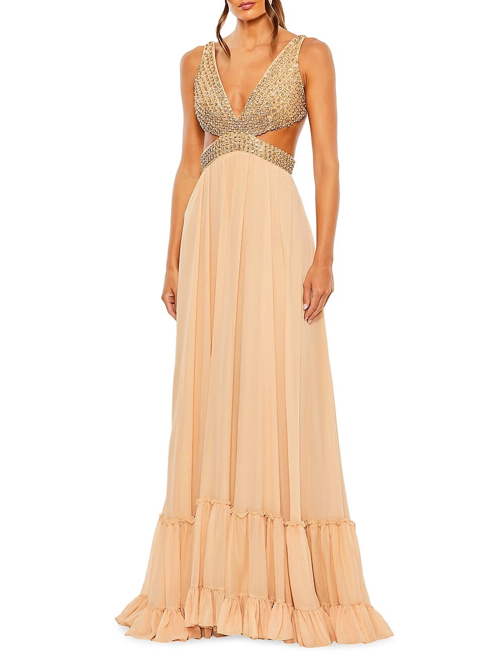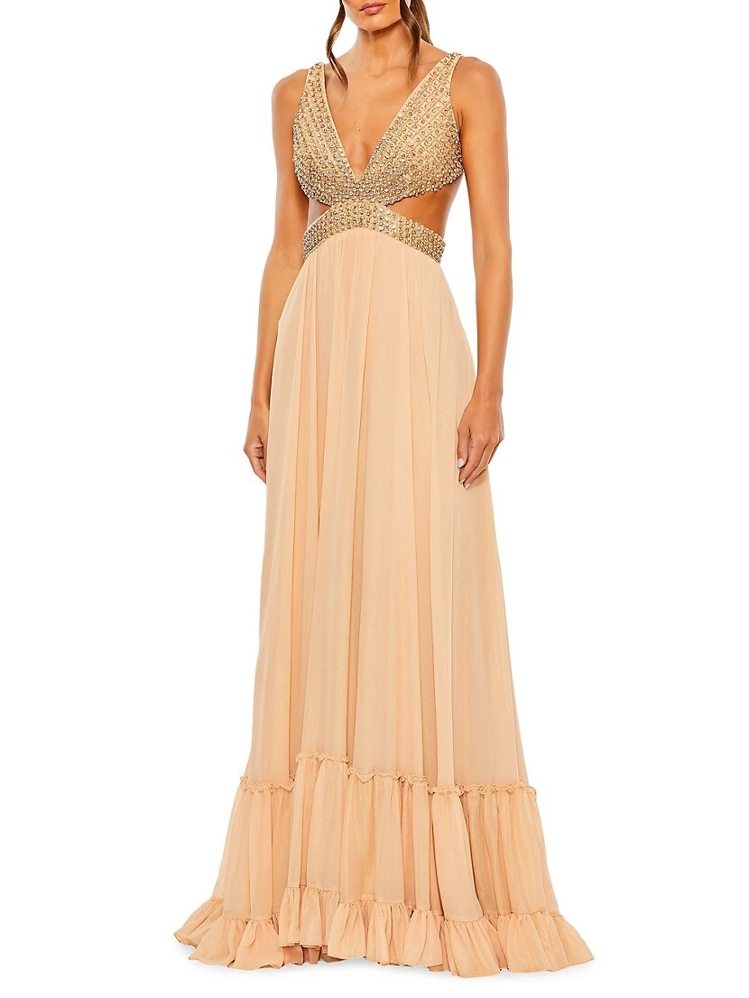 From the Prom Collection. Tailored with a romantic lace-up back, this stunning Mac Duggal chiffon gown is enhanced with embellishments at the cut-out bodice. This floor-length design features a sharp V-neck and ruffled trim at the hem.
