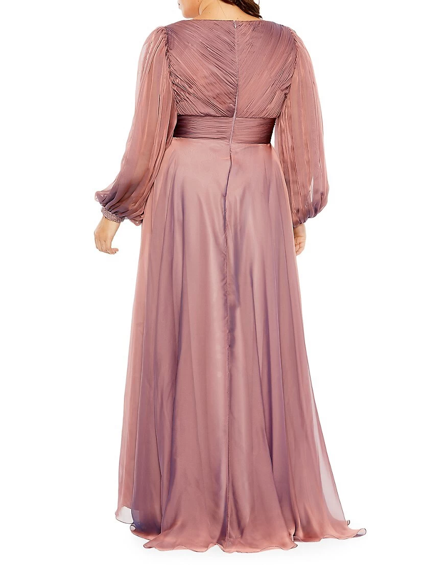 From the Fabulouss Collection. Complete with long puff-sleeves, this Mac Duggal gown is made of flowy chiffon in an A-line silhouette.