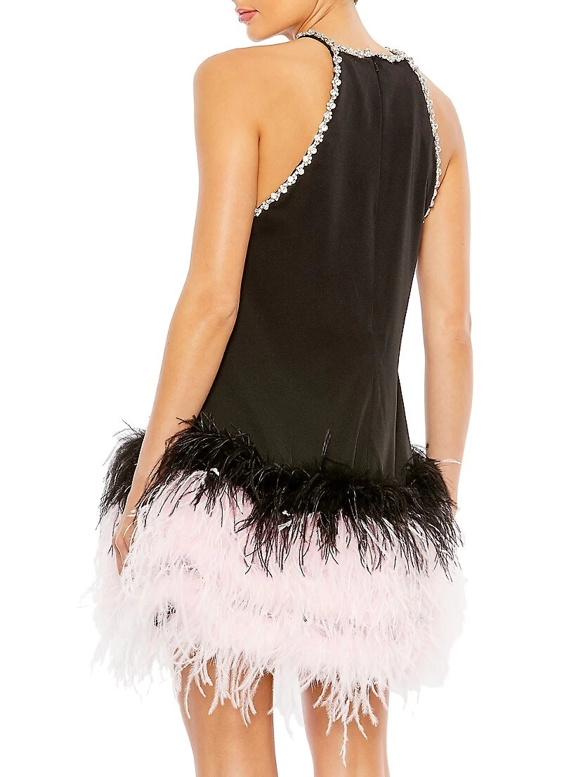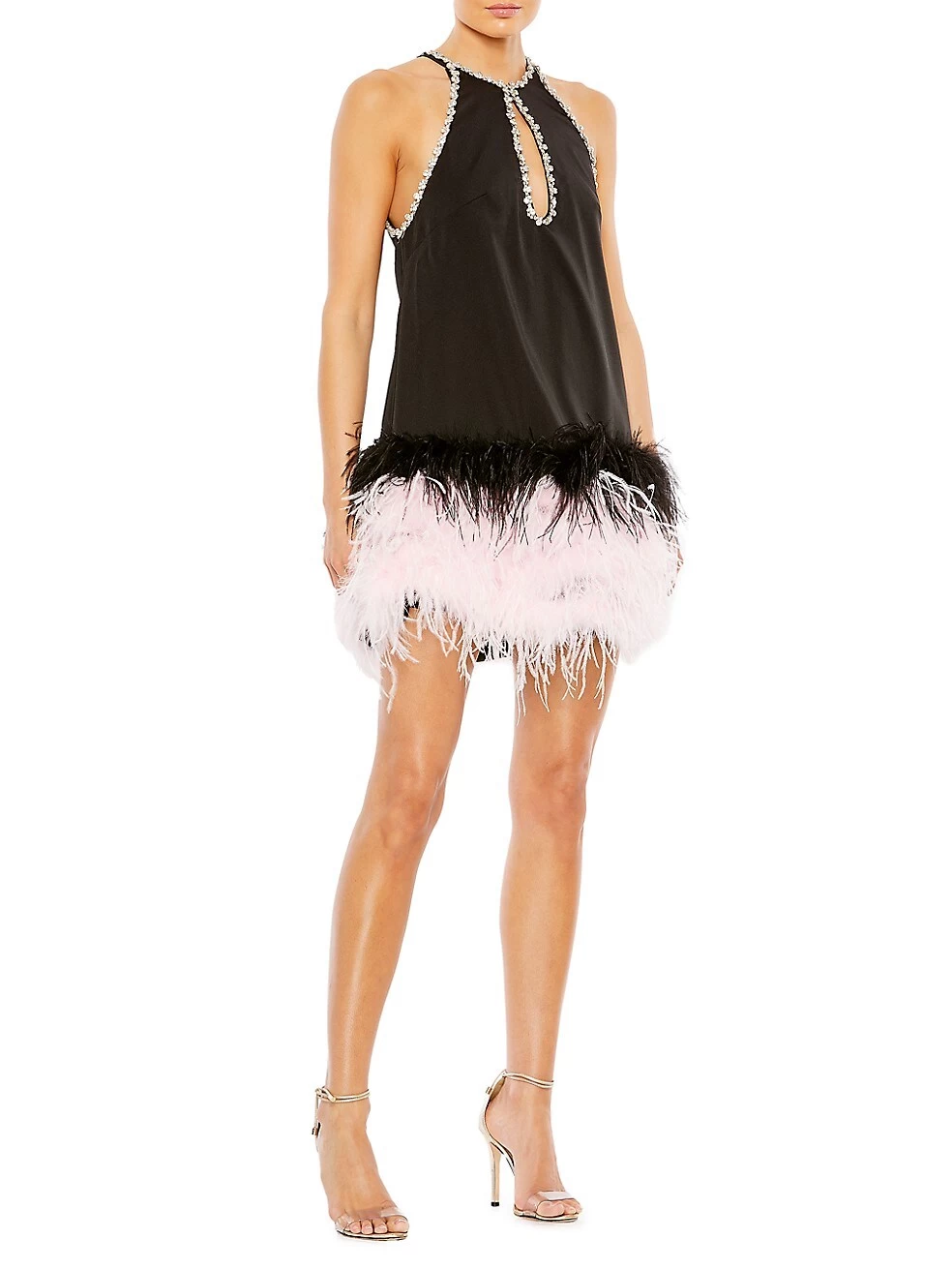 This gorgeous cocktail dress by Mac Duggal flaunts a shimmering rhinestone detail along the neckline and chic feather-trim skirt.