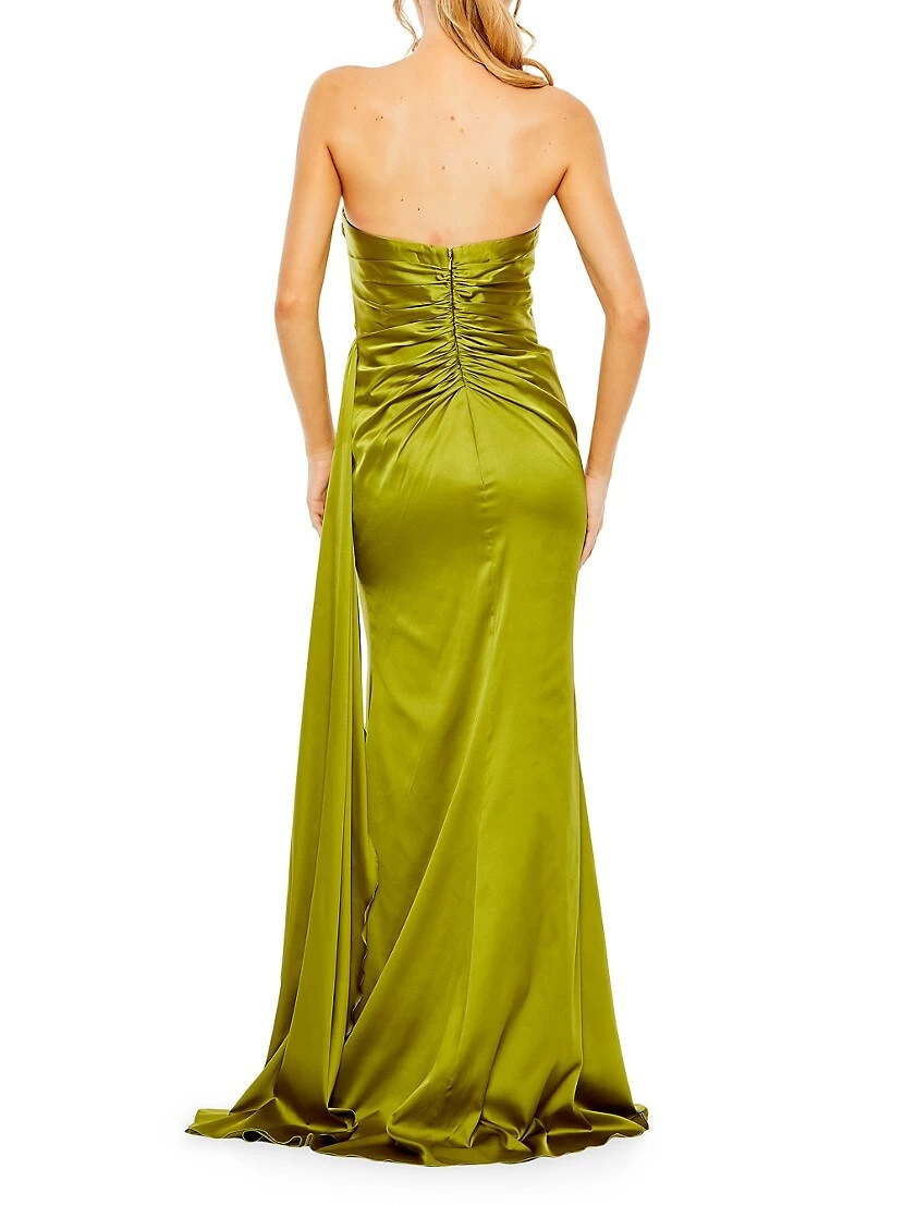 Mac Duggal’s charming satin gown highlights the sweetheart neck with an embellished accent.