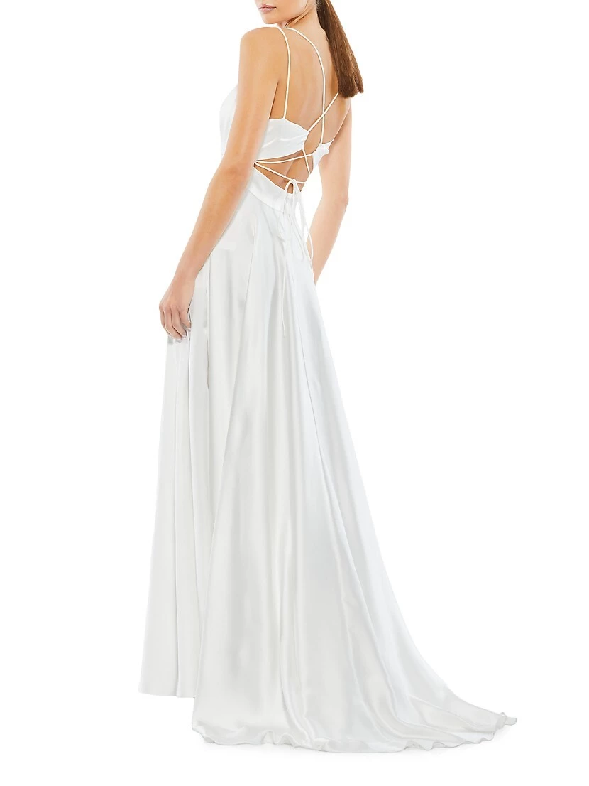 Designed with a boudoir-inspired silhouette, this satin gown has a banded waist and open lattice back.