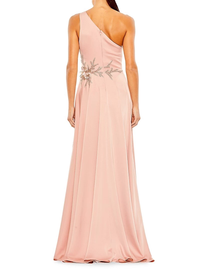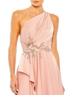 Crafted of smooth satin, this one-shoulder Mac Duggal gown is detailed with a sparkling waist leading to an asymmetric ruffle skirt.