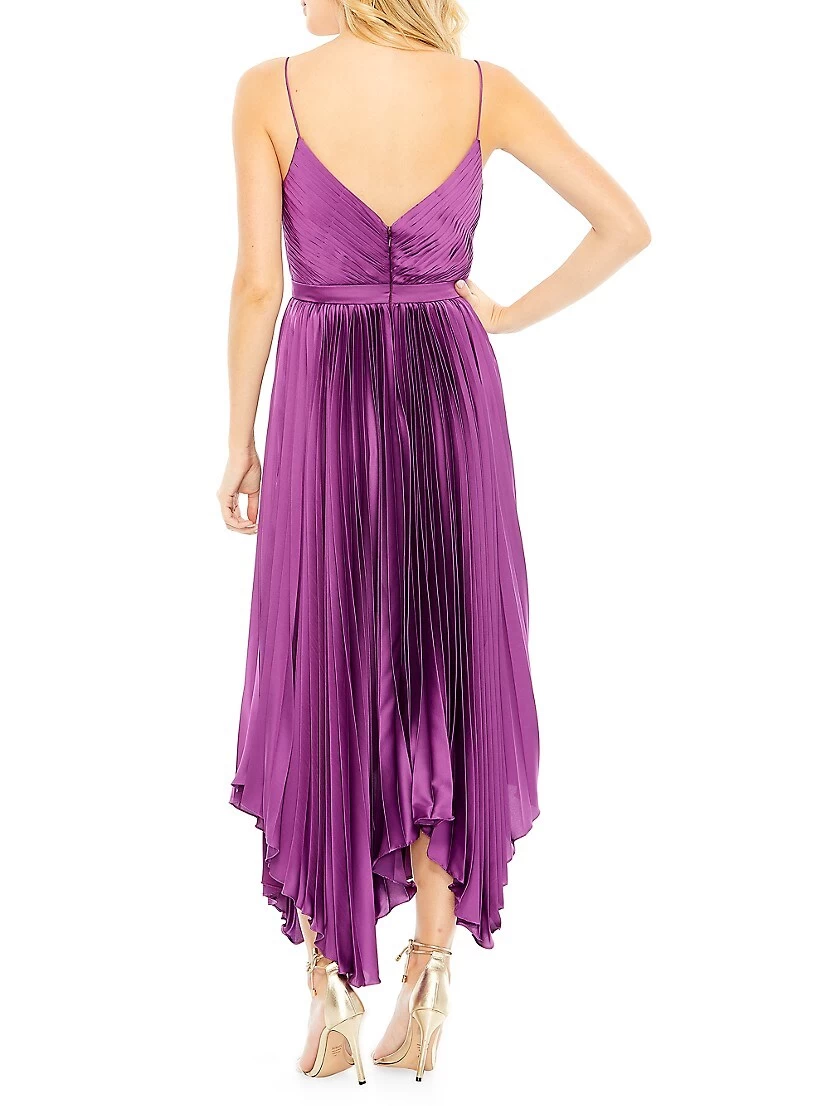 This charming satin cocktail dress is topped with a minimalist bodice, paired with a pleated handkerchief skirt for a voluminous touch.