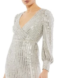 This midi-length cocktail dress features classic bishop sleeves for added volume, adorned with shiny embellished stripes.