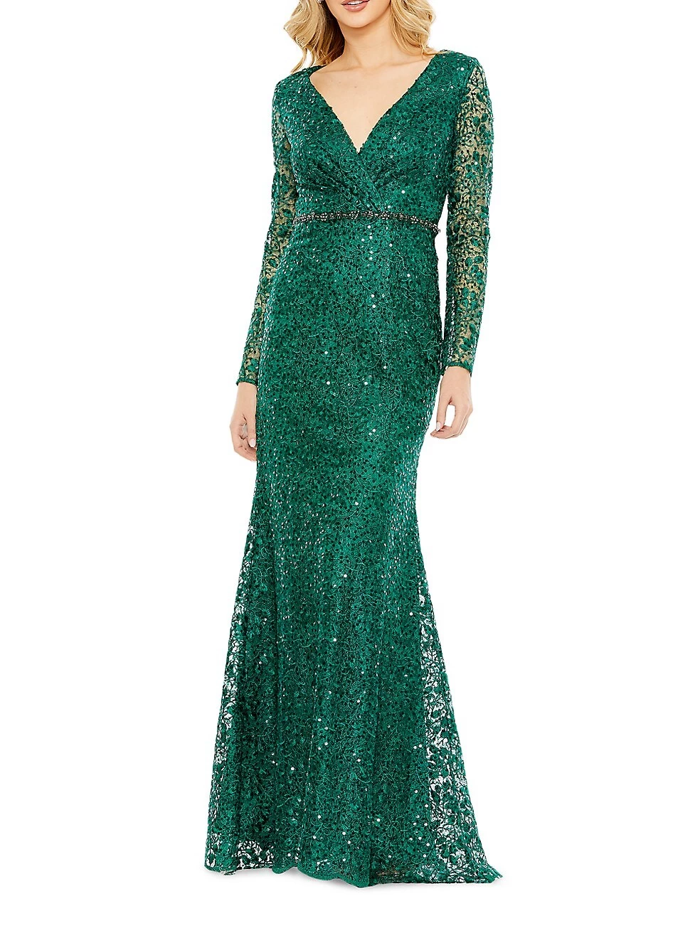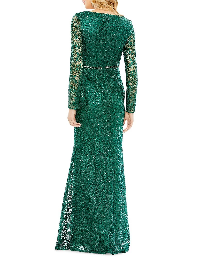 This elegant gown by Mac Duggal is designed with shimmering sequin detail over charming floral embroidery.