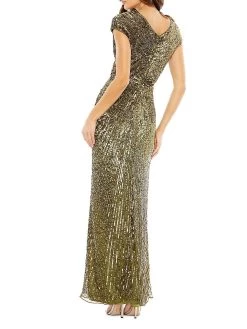 Shimmering sequins cover this elegant evening gown by Mac Duggal. A V-neckline and gathered waist complete this floor-length style.