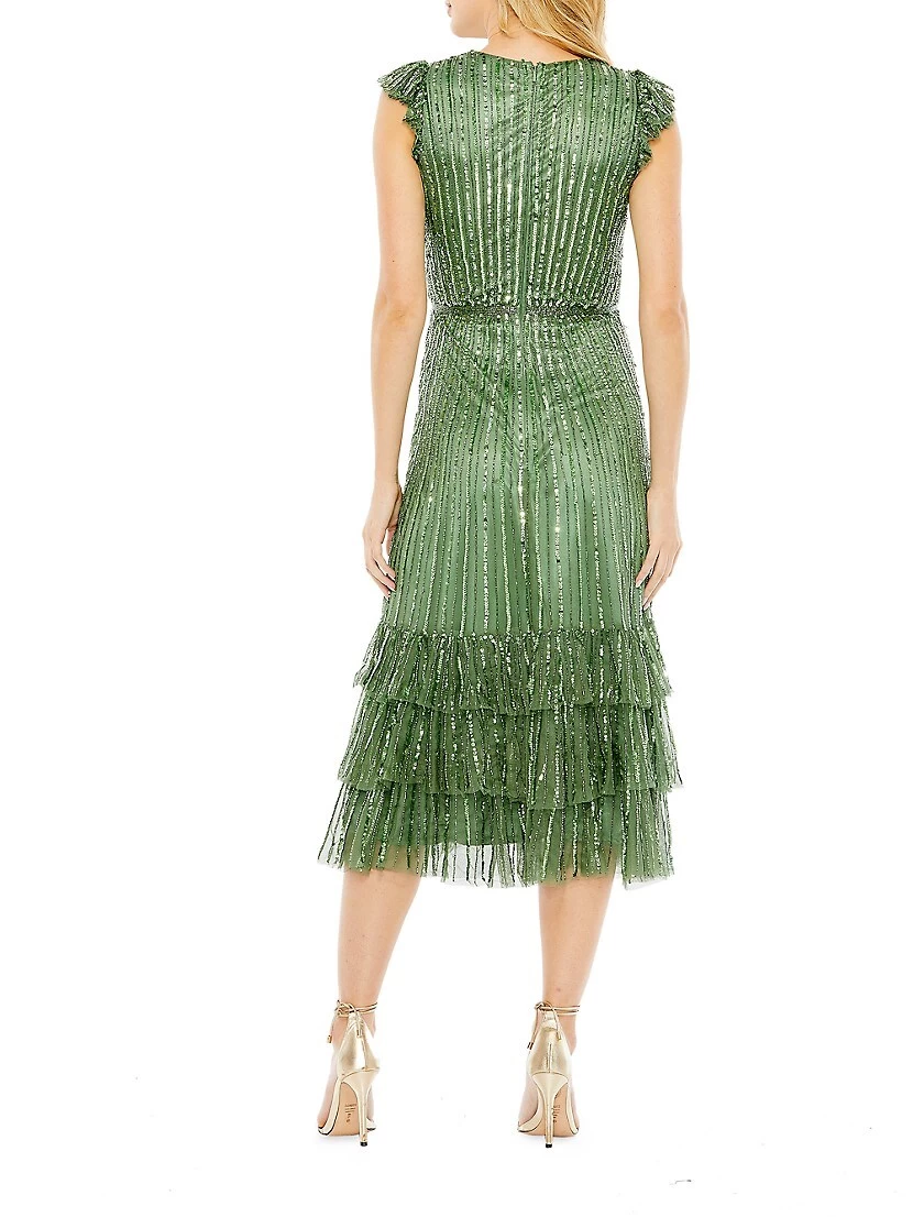 Cut in a chic midi-length, this glimmering cocktail dress by Mac Duggal sparkles with luminous sequins. A V-neckline and tiered hem complete this chic style.