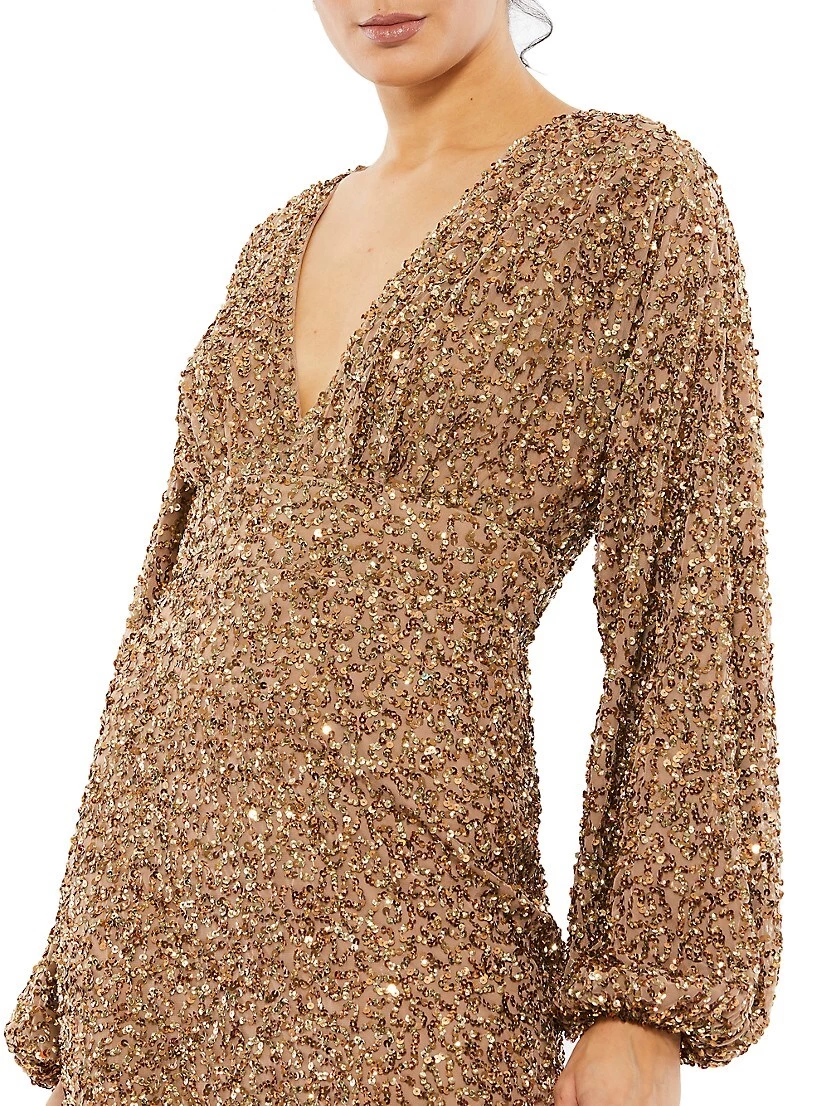 Awash in glimmering sequin, Mac Duggal’s bishop sleeve column gown features a pleated bodice, plunging V-neck, and fitted empire waist.