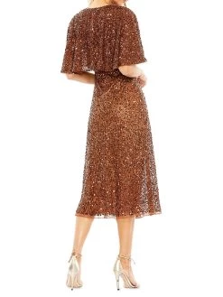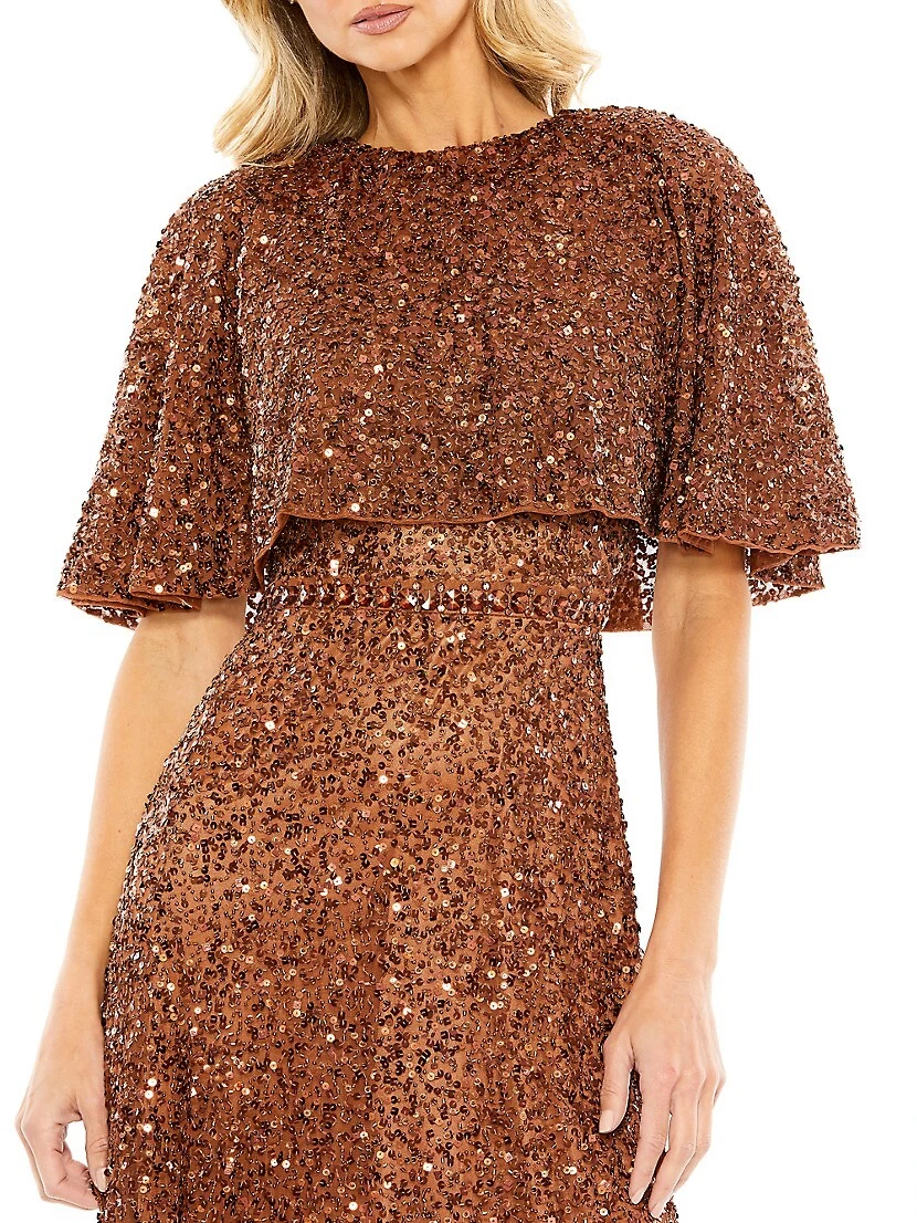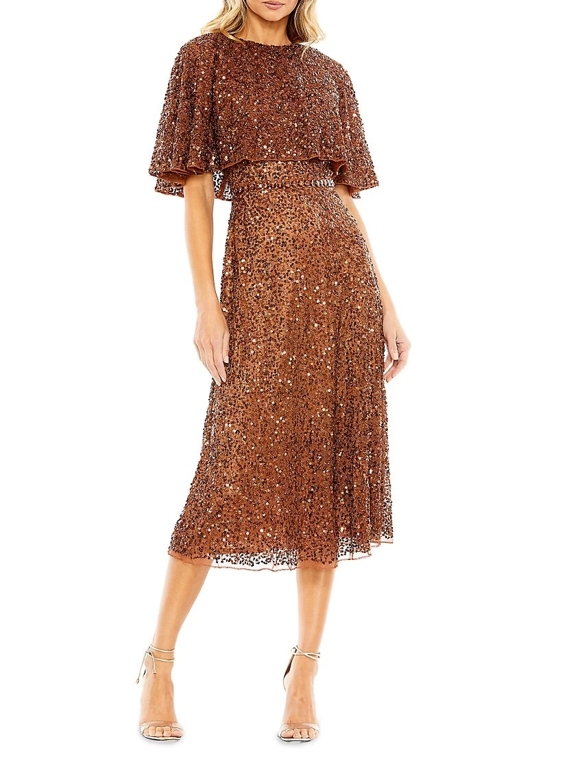 Designed with an elegant cape overlay, Mac Duggal’s Midi-Dress features allover sequins and beading for shine.