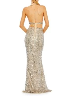 This Mac Duggal sequined mermaid gown features a plunging V-neck and a cut out bodice. An open back with a tie detail completes this sleek style.