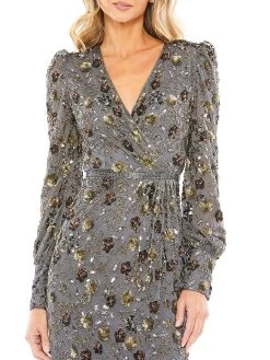 Flattering faux wrap shaping defines the silhouette of Mac Duggal’s sequined Midi-Dress.
