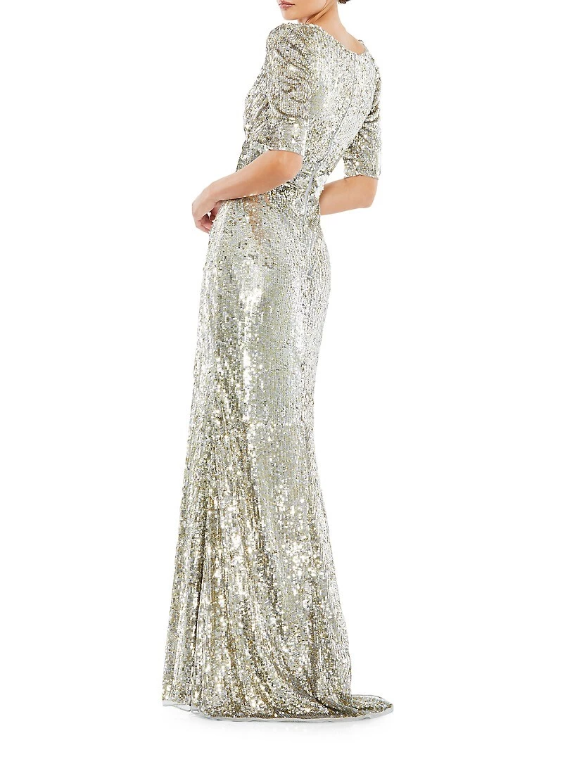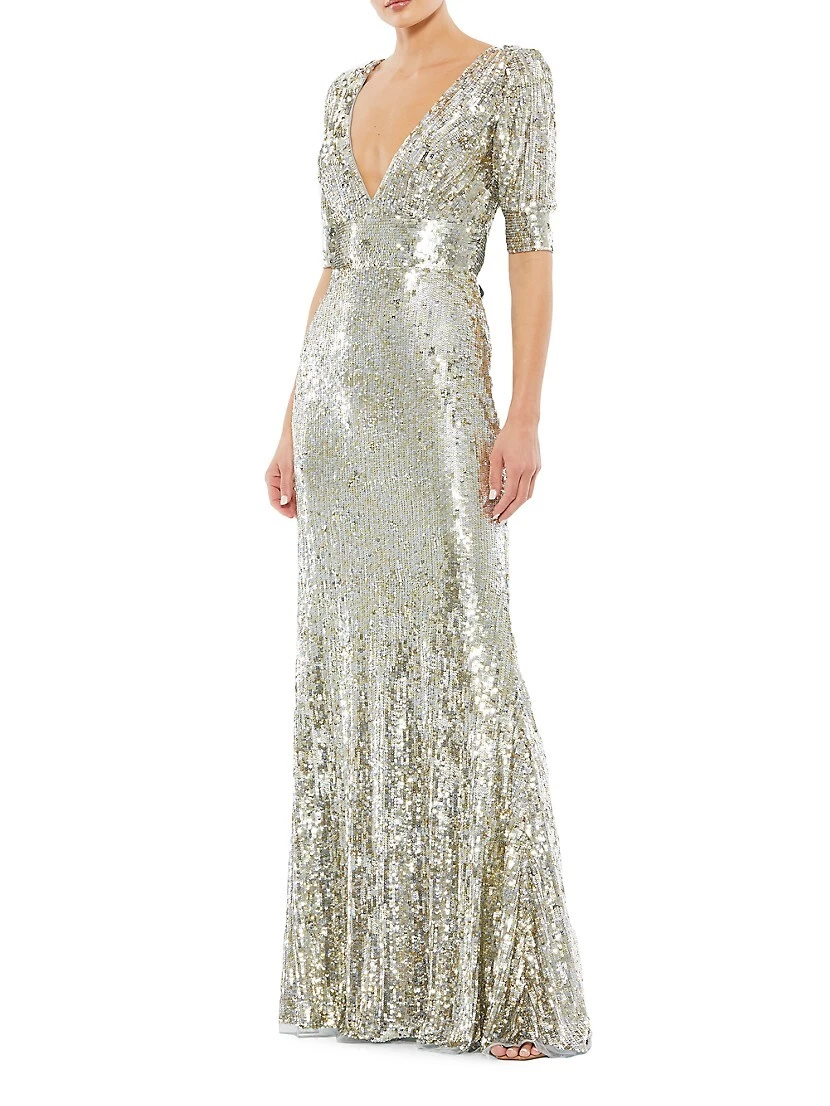 This fitted sequined empire waist gown features a plunging V-neck and half sleeves.