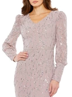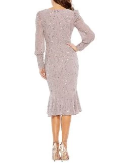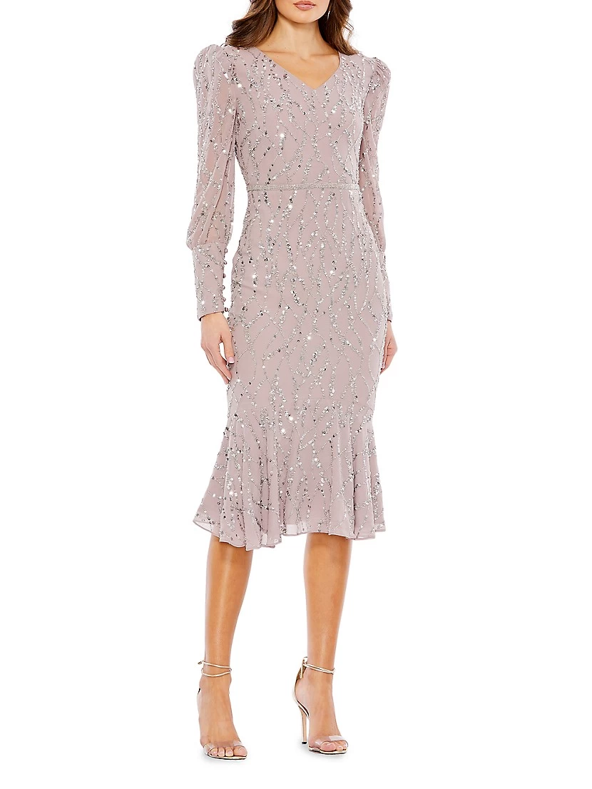 A trumpet hem lends whimsy to Mac Duggal’s sequined V-neck Midi-Dress.