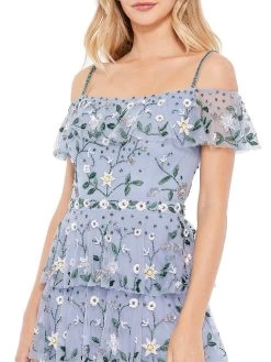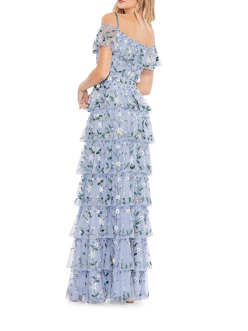 Tiered sleeveless gown with intricate bead-embellished floral patterning.